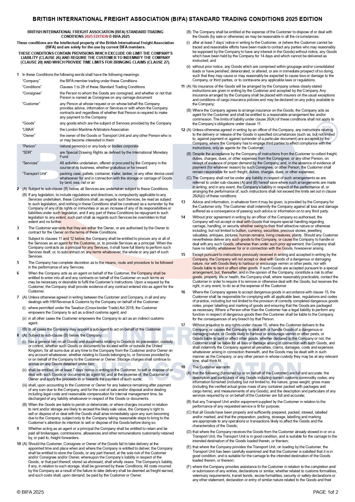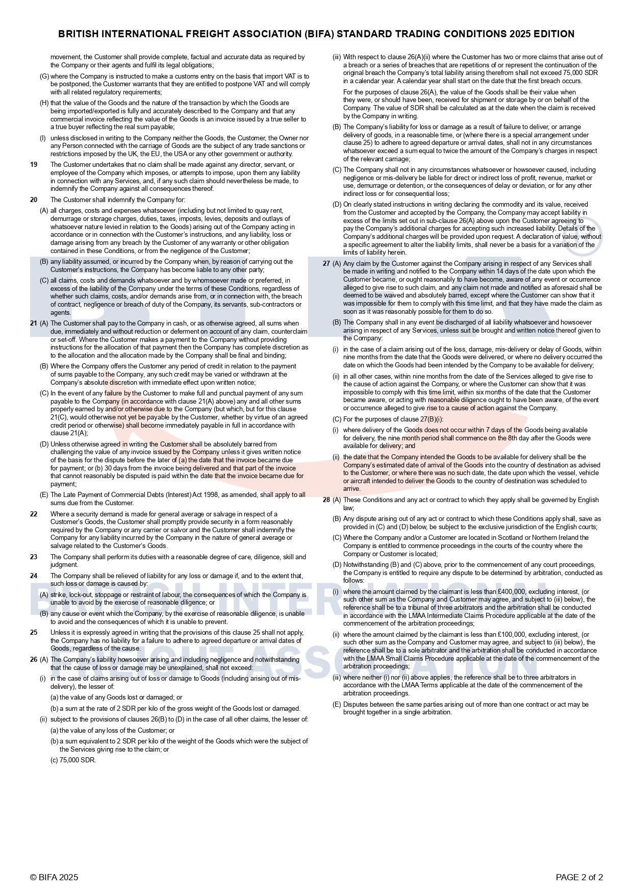 BIFA Standard Trading Conditions 2025